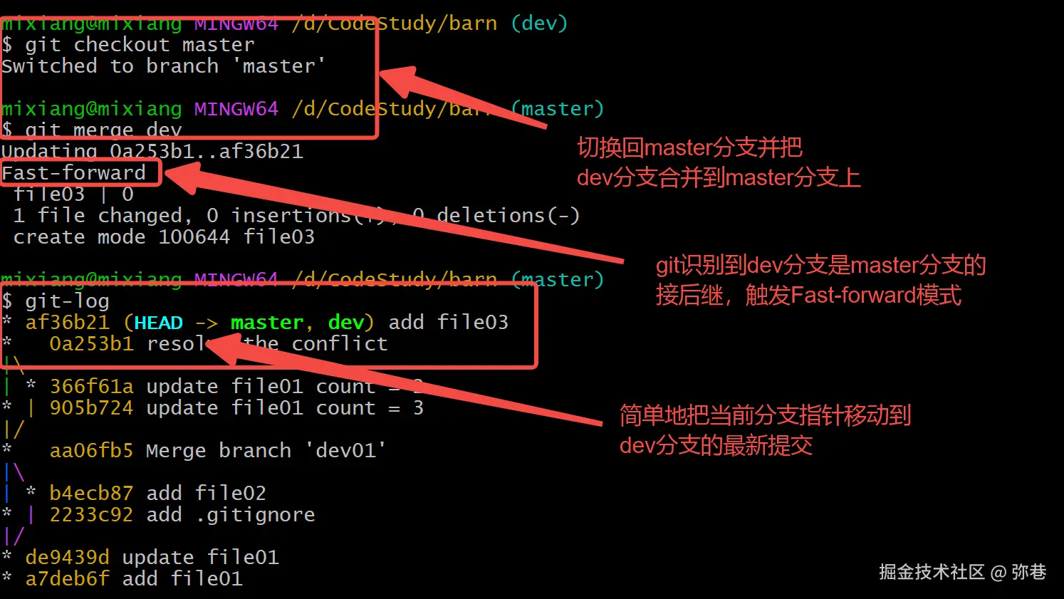 Git会自动识别到dev分支上master分支的直接后继,即master分支上有的dev分支也都有,这时合并就不会产生冲突,就会触发Git的快进模式,即Fast-forward模式,Git会简单地把当前分支指针指向dev分支的最新提交,这时master分支也就处于这个地方,而且不会产生以往合并分支时类似于小桥一样的结构。