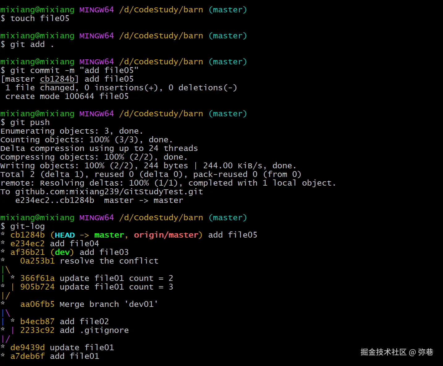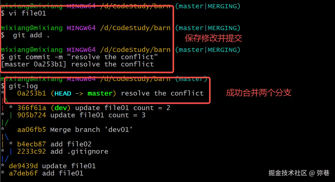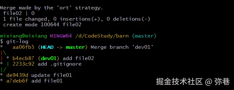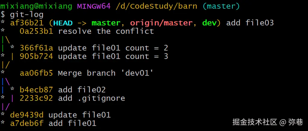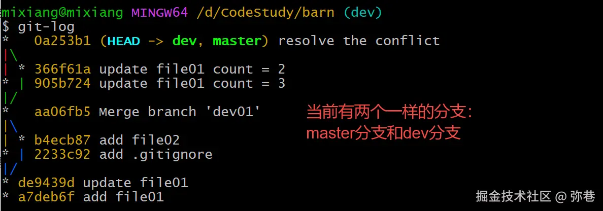 最后输入git-log查看提交记录,发现已经成功处理了冲突,dev分支也已经合并到master分支上。
