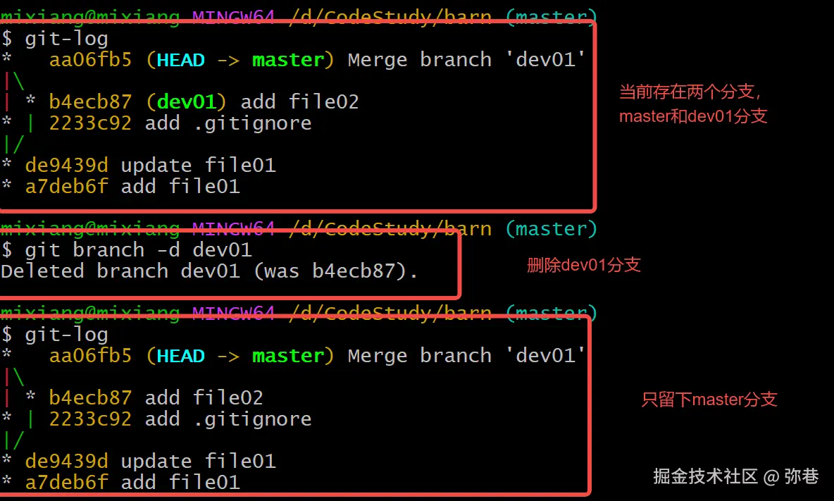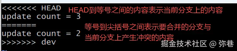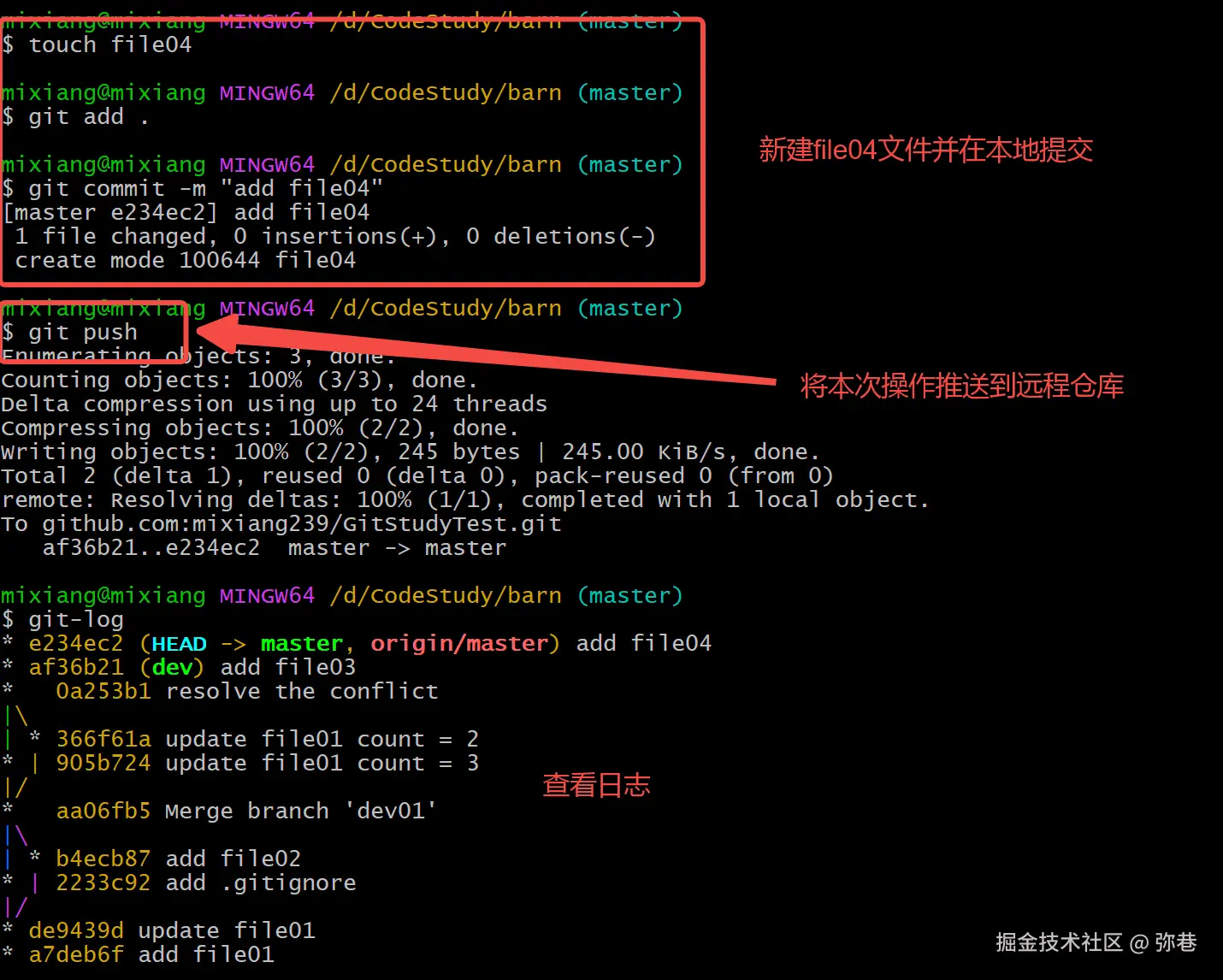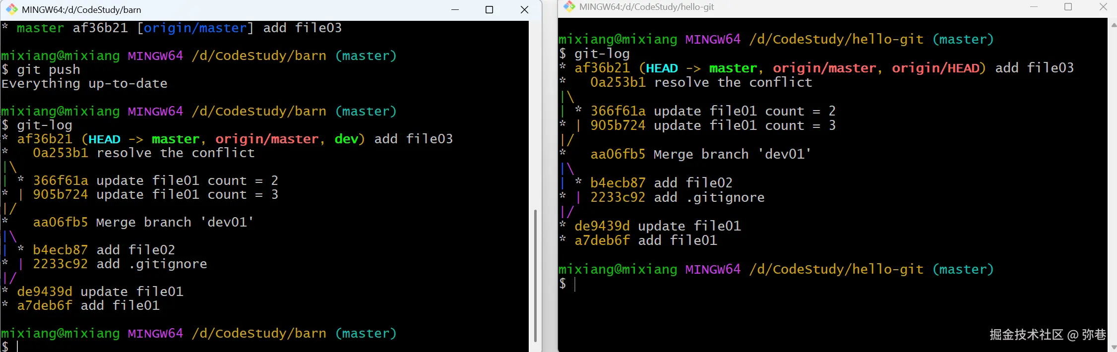 最后输入git-log查看提交记录,发现已经成功处理了冲突,dev分支也已经合并到master分支上。