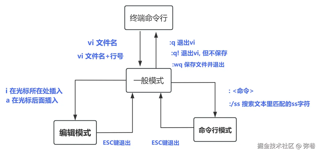 说明:在终端输入 vi 文件名打开文件,这时进入"一般模式"。在一般模式下,按 i或 a键进入"编辑模式",就可以打字修改内容了。在一般模式下,按 :键进入"命令行模式",可以执行保存、退出等命令。