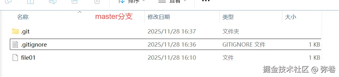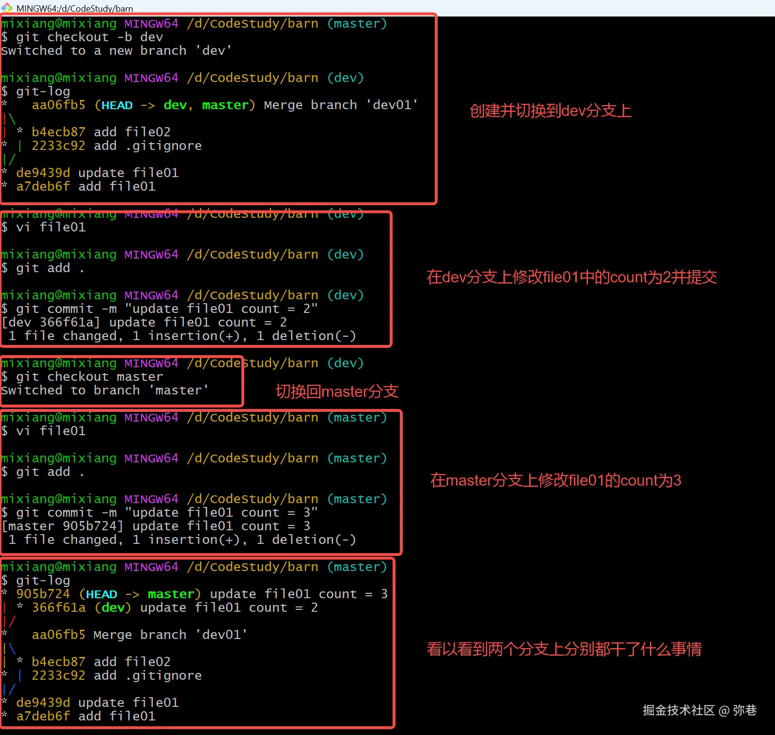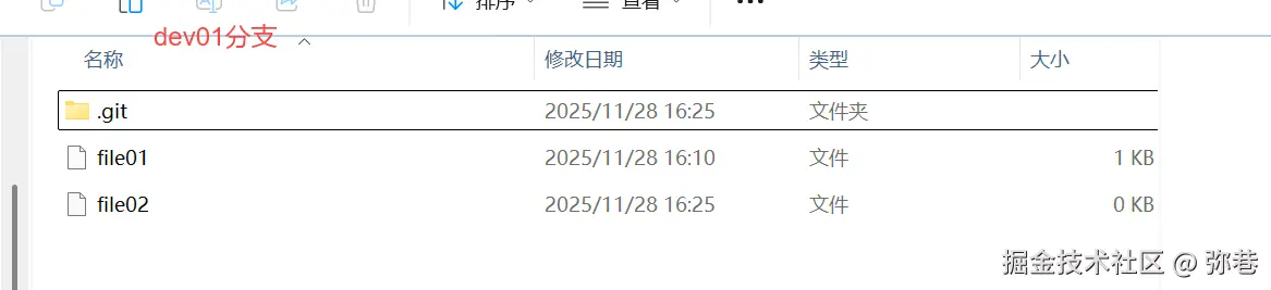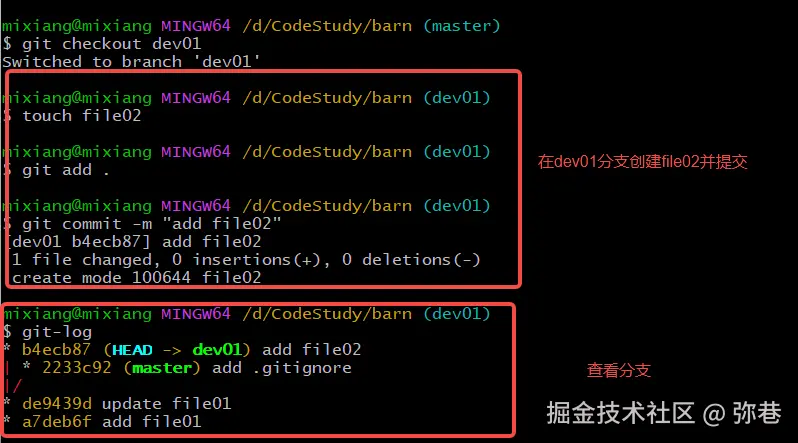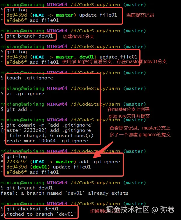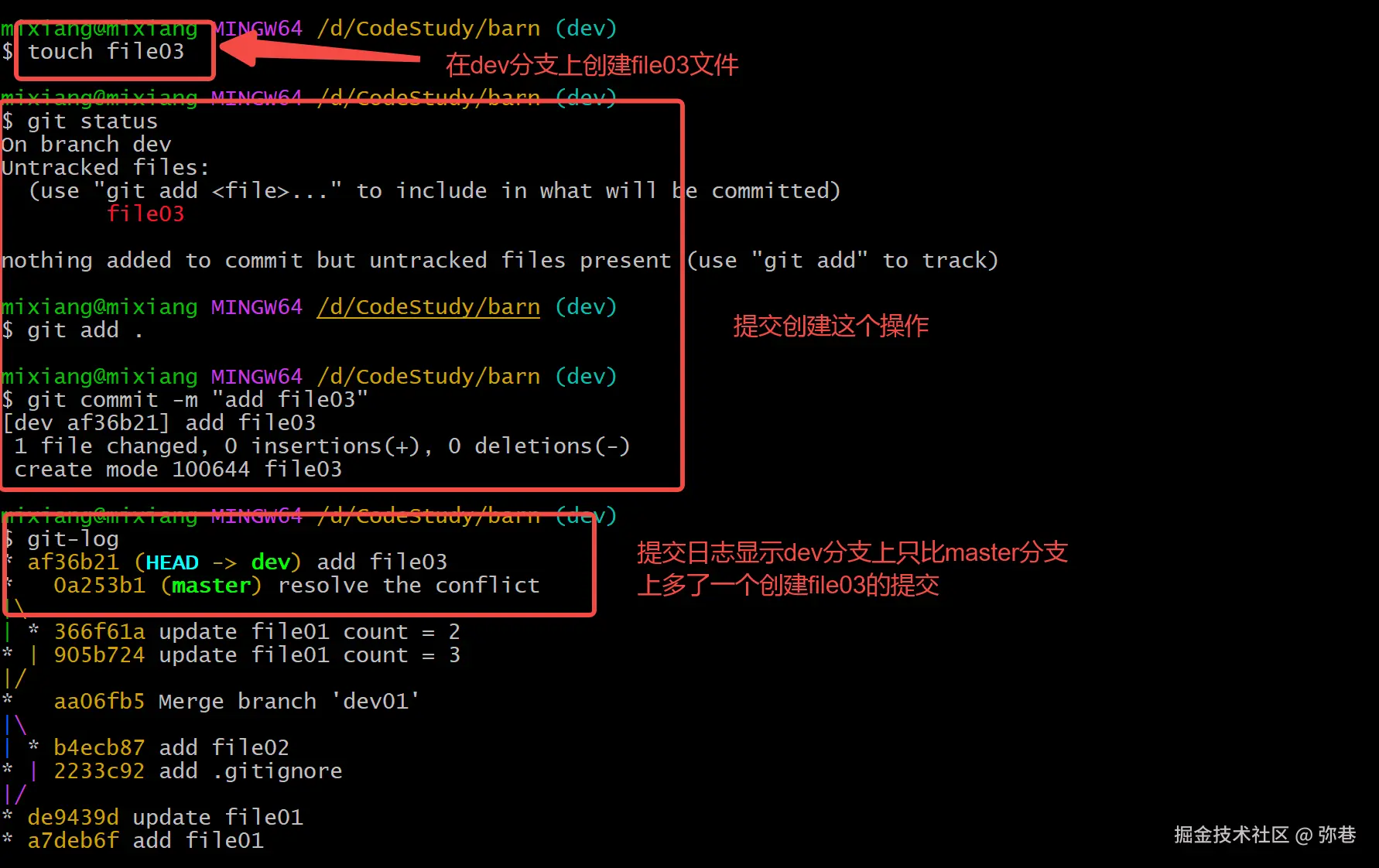 查看当前分支,日志显示当前有两个一模一样的分支:master分支和dev分支。随后我们在dev分支上创建file03文件并提交: