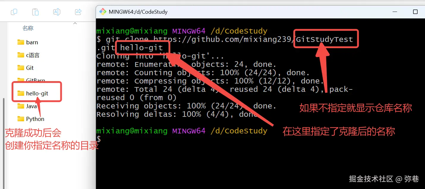 在想要克隆的目录下右键打开Git Bash,输入git clone <仓库路径> <本地名称>,如果不指定目录就会自动新建一个目录,名称就是远程仓库的名称。等待一会就克隆成功了,它和我们本来的本地库和远程仓库的内容都是一模一样的。关掉刚刚克隆仓库的Git Bash,因为这是在hello-git外面打开的Git Bash是操作不了hello-git这个库的,进入hello-git右键打开Git Bash,输入git-log,在刚刚推送的Git Bash中也输入git-log: