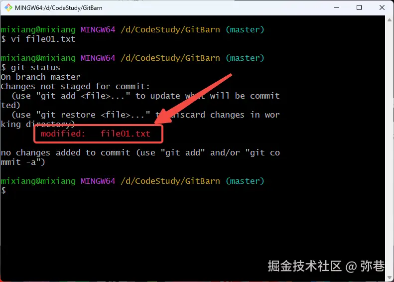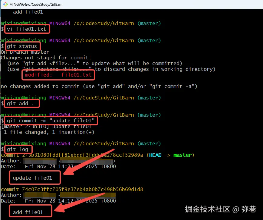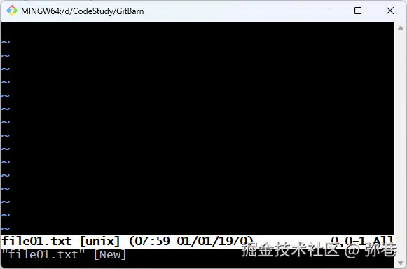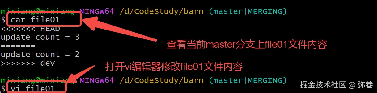 可以看到Git已经帮我们列出冲突产生的位置,并把不同分支上的内容都展示出来,以便我们处理冲突。输入vi file01来修改这个冲突: