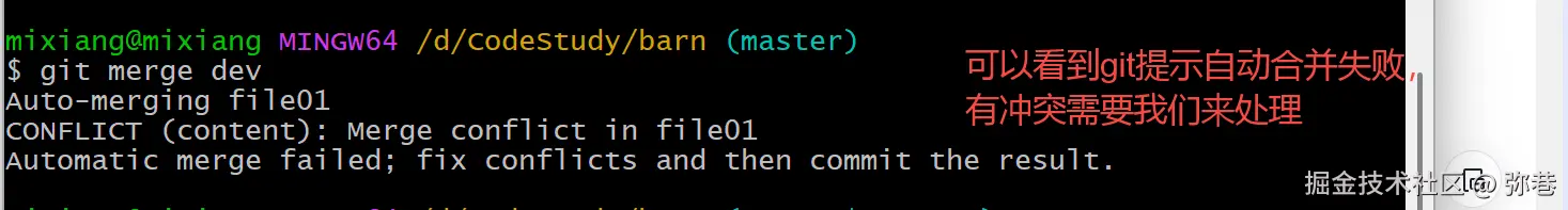 Git提示自动合并失败,需要我们来手动处理冲突。这时输入cat file01查看file01当前内容: