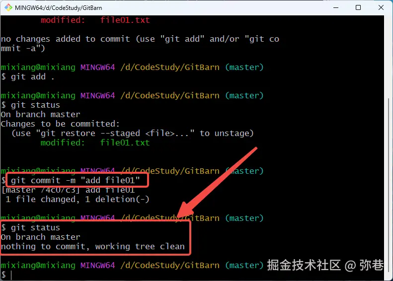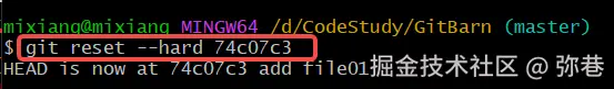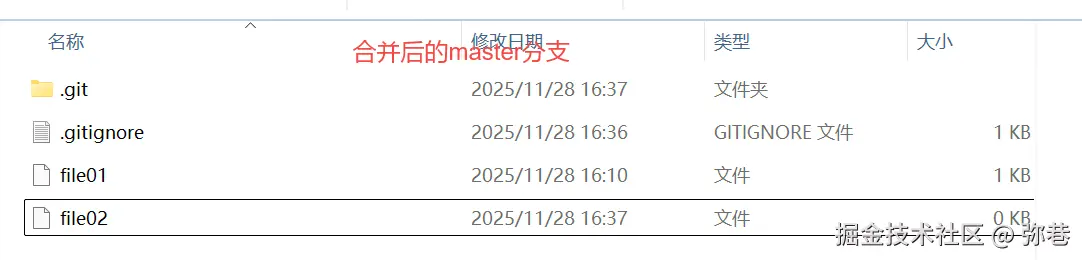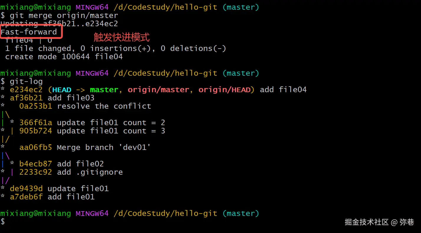 但是当前本地库还处于add file03,本地的master分支中并没有add file04这个提交,说明fetch指令只会拿到更新,并不会把这个更新合并到本地分支。这时我们可以通过merge指令来将远端master分支合并到本地master分支上: