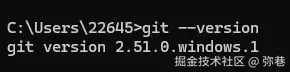 随后,桌面按下win+R,输入cmd回车,打开cmd终端,输入git --version,若出现版本号,则说明Git配置成功: