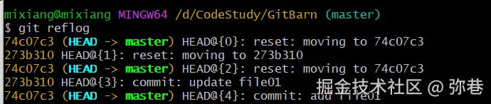 再次查看提交日志,发现dev分支上只比master分支上多了一次提交,如果这时我们将dev分支合并到master分支上: