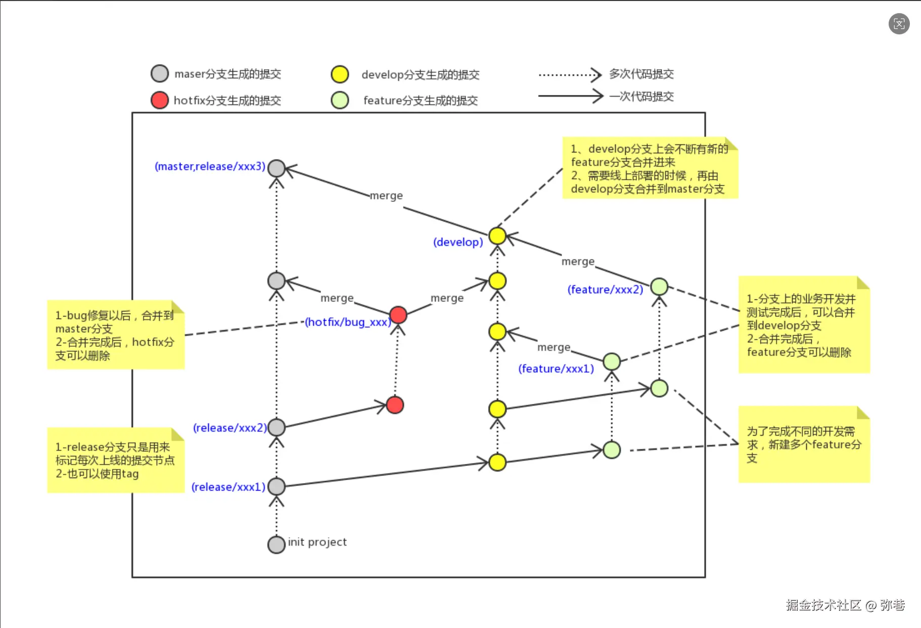 另外,在图中还有hotfix分支,这个分支是用来修复已经发布的版本中产生的bug。比如图中release2版本中用户反馈了一个bug,我们现在要去修复这个bug,可肯定不能在master分支上直接修改,这会影响到所有的用户。这时我们西欧iiu可以在当前版本上创建一个hotfix分支,在这个分支上进行一系列的修改、测试,最终确定bug已经修复后,再合并到master分支上形成下一个ralease版本。随后还要将hotfix分支合并到devdelop分支上,因为如果不合并到develop分支上,后续develop分支新功能开发完毕合并到master分支上时,就会丢失先前修复的提交,所以这里还要合并到develop分支上。