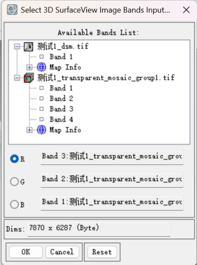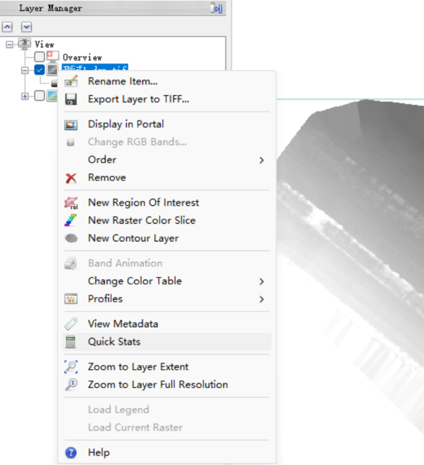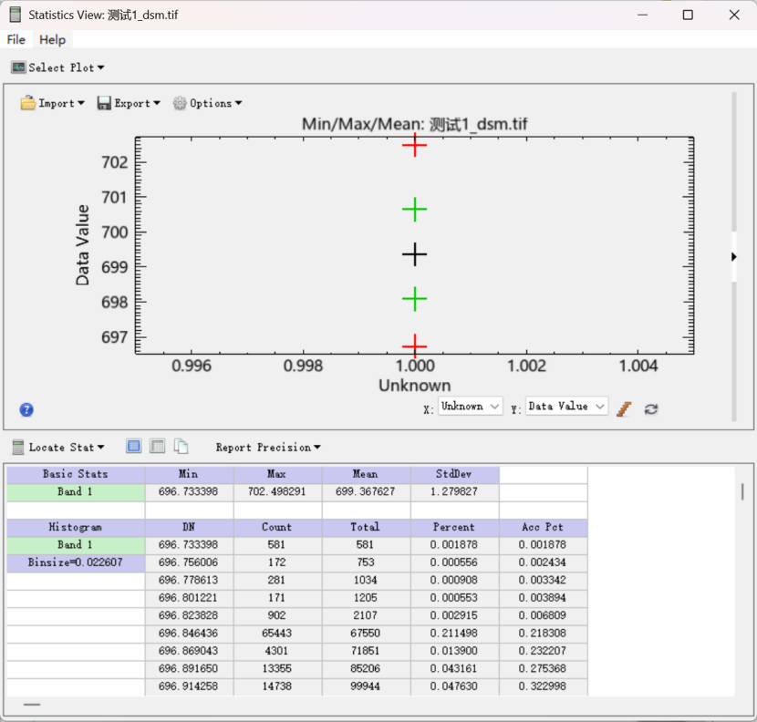 数据导入与预处理 :将 Pix4D 生成的多波段正射影像和 DSM 数据导入 ENVI 软件,通过 "Layer Manager" 中的 "Quick Stats" 功能统计 DSM 的高程范围,本次实验中高程最小值为 696.733398 米,最大值为 702.498291 米,为三维建模提供关键参数参考。