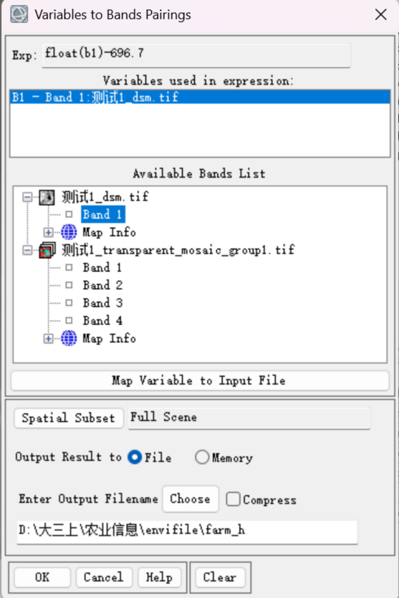作物高度反演 :作物高度是反映作物生长状况的关键指标,直接关联产量预估、长势监测等农业应用。其核心原理是通过 DSM 与数字高程模型(DEM)的差值计算得到冠层高度模型(CHM),即作物冠层高度 = 地表高程(DSM)- 地面高程(DEM)。在实验中,由于未获取单独的 DEM 数据,采用 DSM 与区域最低高程(696.7 米)的差值近似替代,通过 ENVI 的 "Band Math" 工具输入表达式 "float (b1)-696.7"(b1 对应 DSM 数据),生成 CHM 文件,从而反演得到作物的相对高度。