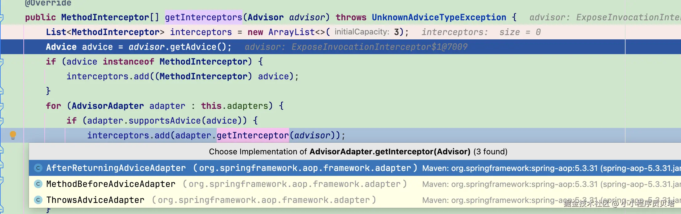 MethodInterceptor[] interceptors = registry.getInterceptors(advisor);