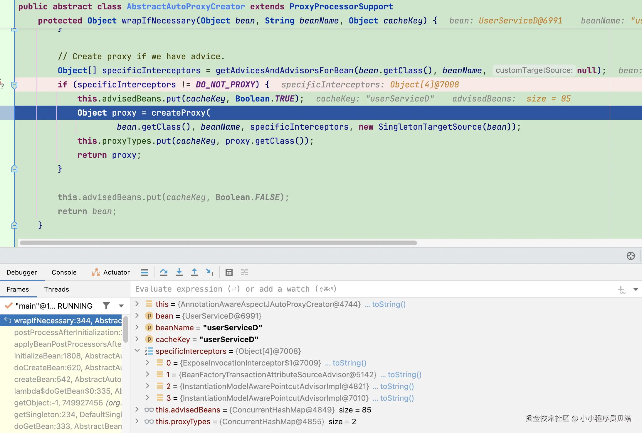 如上一篇断点如下:自定义的service中方法上添加有 @Transactional 注解(本文重点) 以及被自定义的两个前置通知的方法命中(这个不是本文的重点) ,所以可以发现这里spring创建出了4个interceptor。接着会进入org.springframework.aop.framework.autoproxy.AbstractAutoProxyCreator#createProxy 方法进行创建代理