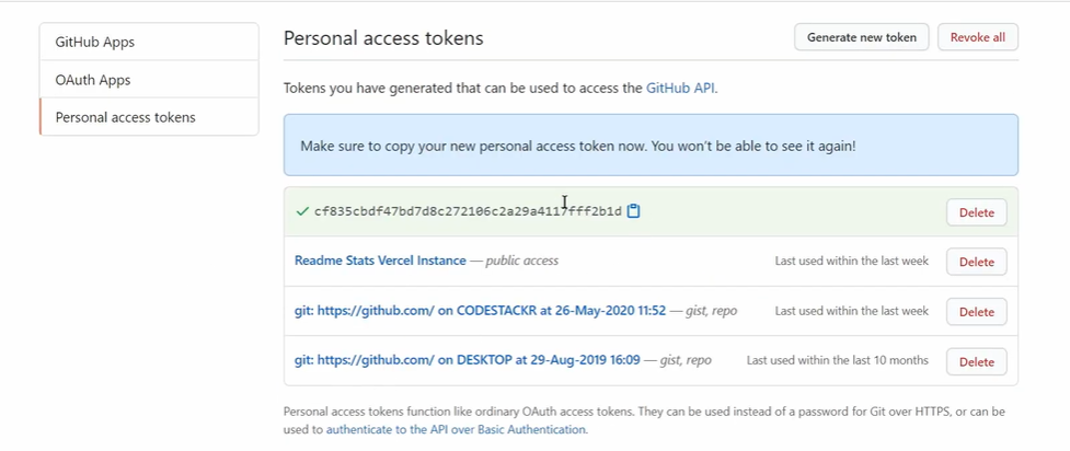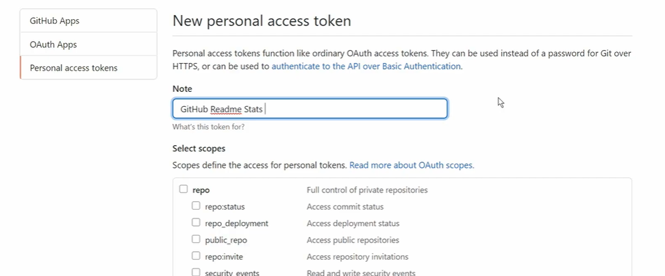 首先fork github-readme-stats[2]这个项目,然后点击Account -> Settings -> Developer Settings -> Personal access tokens -> Tokens (classic),生成自己的token即可,生成后复制并保存这个token。