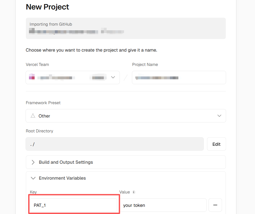 选择Github账号,项目名称。只需要配置环境变量,注意,这里红框只能填PAT_1,value这里填入Step 1生成的token。最后点击最下面的Depoly按钮。