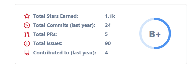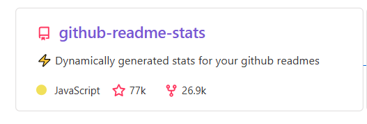 github-readme-stats 是一个开源项目,由anuraghazra创建和维护。它是一个动态 SVG 图片生成服务,能够实时获取你的 GitHub 统计数据,并将其以美观的卡片形式展示在你的 GitHub个人资料 README 或其他网页上。目前在Github上已经收获了77k的star,其受欢迎程度可见一斑。