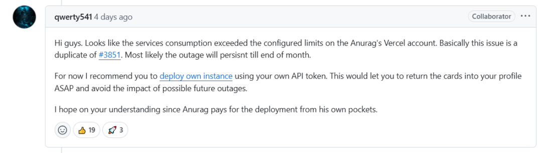 在issue区看了下,原来是看起来是服务消耗量已经超出了 Anurag 账户在 Vercel 上的配置限制,并且这次故障很可能会持续到月底(虽然明天就是新的一个月了),最最重要的是Anurag 正在用自己的钱支付这个部署服务的费用,这老哥纯纯的用爱发电。