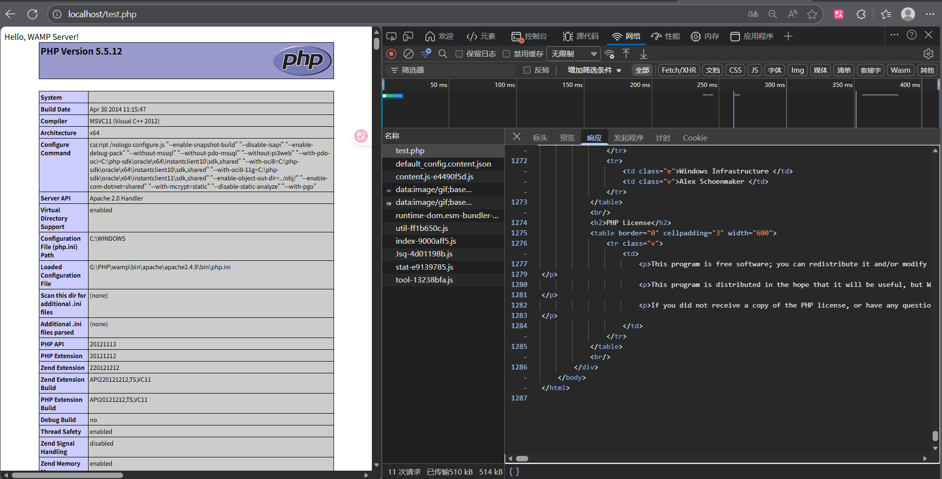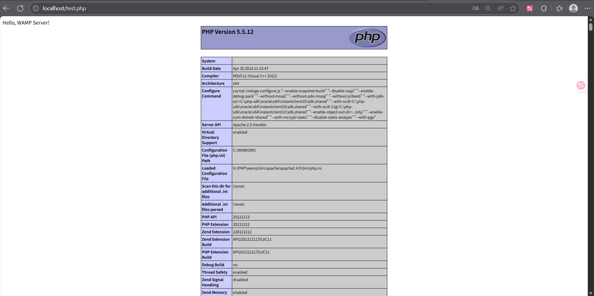 php<?php echo "Hello, WAMP Server!"; phpinfo(); ?>- 访问