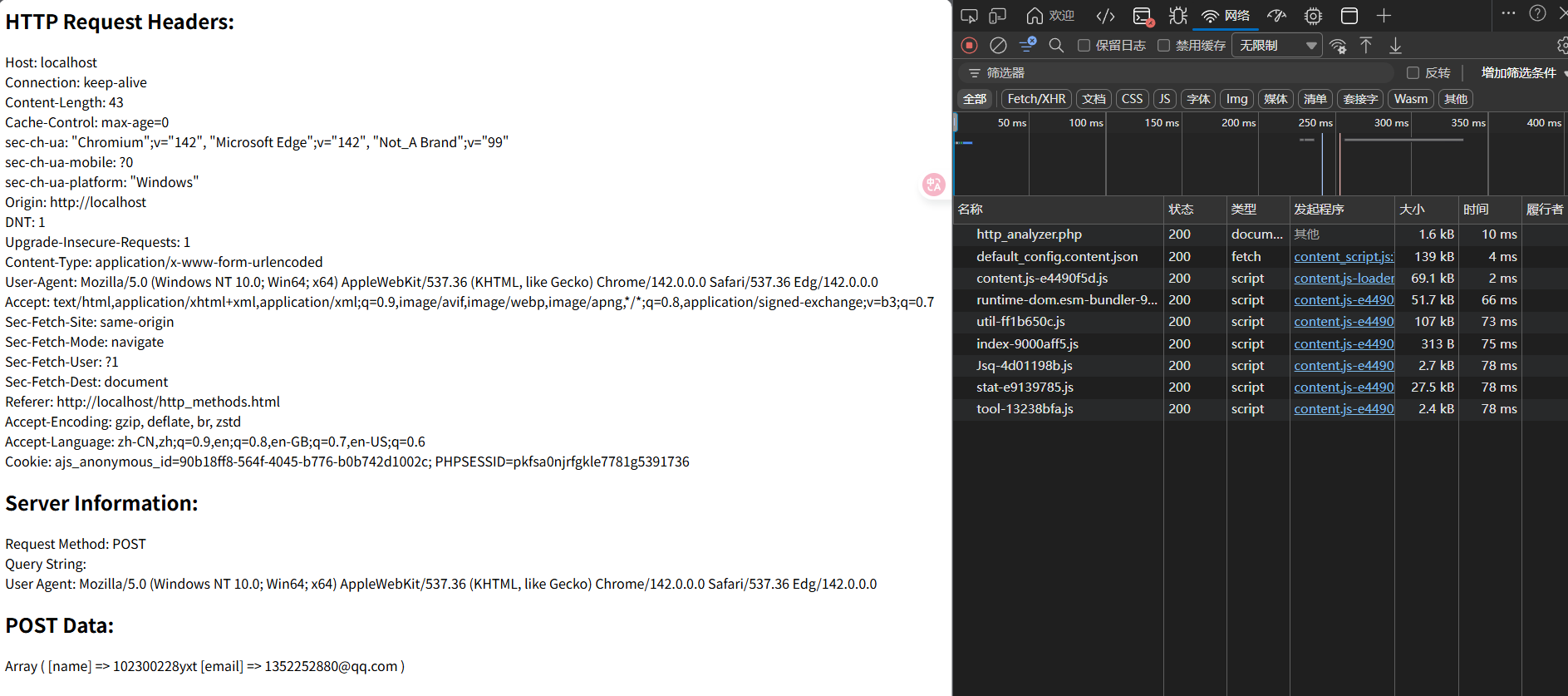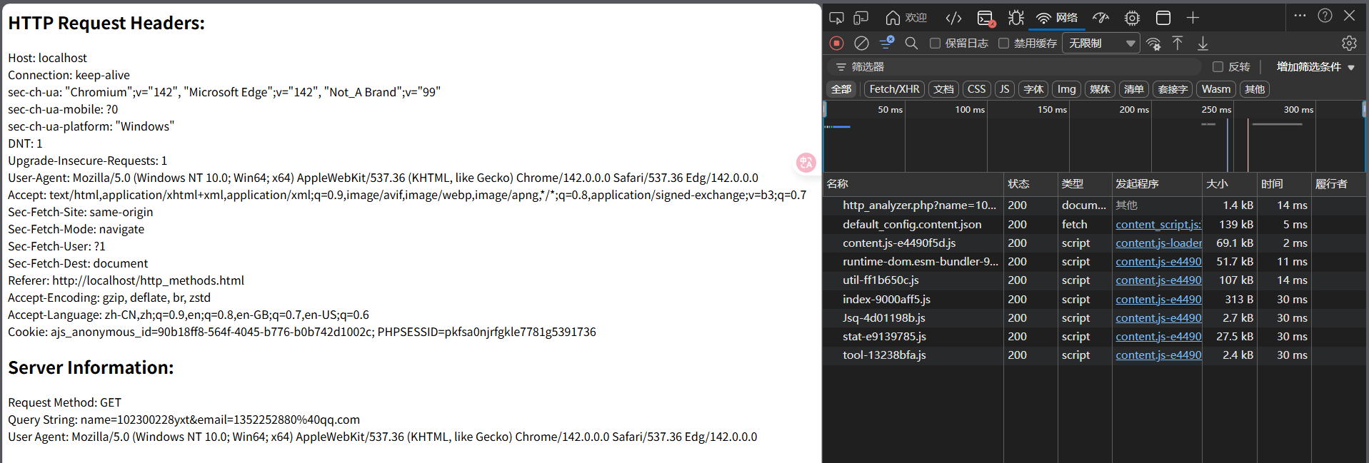 html<!DOCTYPE html> <html> <head> <title>HTTP Methods Test</title> </head> <body> <h2>GET Method Test</h2> <form action="http_analyzer.php" method="get"> Name: <input type="text" name="name"><br> Email: <input type="text" name="email"><br> <input type="submit" value="GET Submit"> </form> <h2>POST Method Test</h2> <form action="http_analyzer.php" method="post"> Name: <input type="text" name="name"><br> Email: <input type="text" name="email"><br> <input type="submit" value="POST Submit"> </form> </body> </html> - 创建