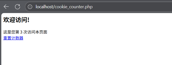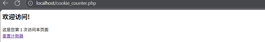 php<?php $visit_count = 1; // 检查是否已有访问计数 if(isset($_COOKIE['visit_count'])) { $visit_count = $_COOKIE['visit_count'] + 1; } // 设置Cookie,有效期1小时 setcookie('visit_count', $visit_count, time() + 3600); echo "<h2>欢迎访问!</h2>"; echo "这是您第 " . $visit_count . " 次访问本页面"; // 提供重置功能 echo '<br><a href="?reset=1">重置计数器</a>'; if(isset($_GET['reset'])) { setcookie('visit_count', '', time() - 3600); // 删除Cookie header("Location: cookie_counter.php"); // 重定向 } ?> - 创建