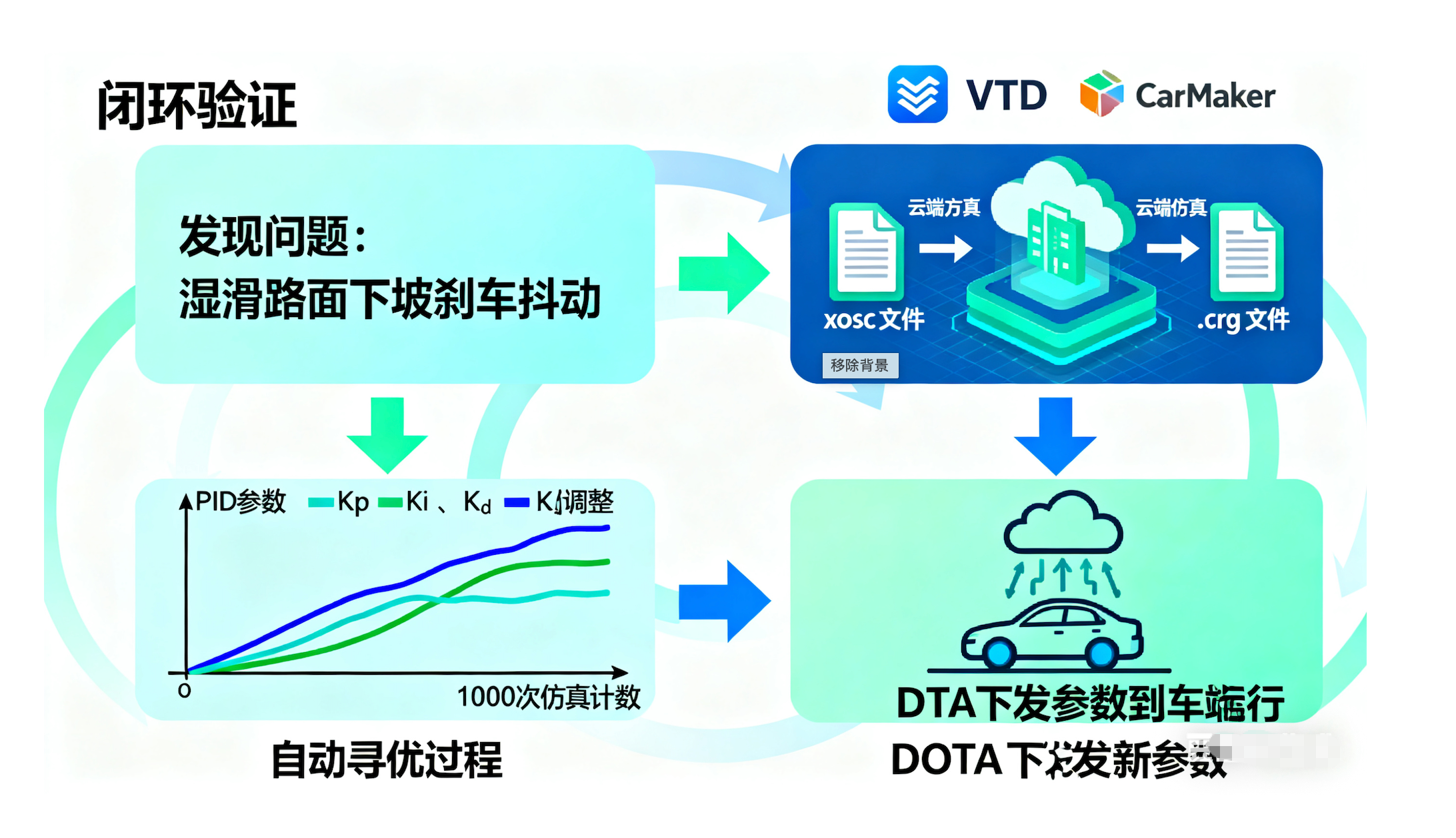 云端仿真:将生成的 .xosc(剧本)和 .crg(湿滑路面模型)推送到 VTD/CarMaker 中。