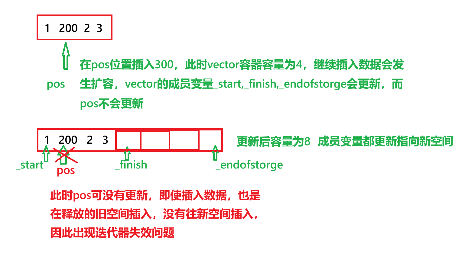 在这个过程中,旧内存被释放,而原来的迭代器pos(包括_start和_finish)都指向已经释放的内存,这些迭代器就失效了。