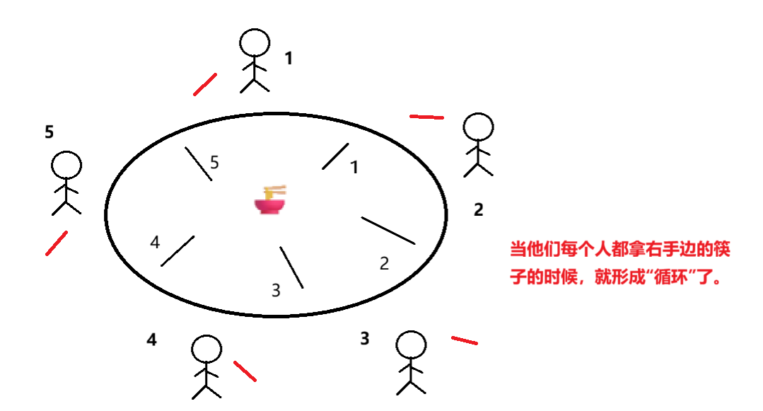 而哲学家就餐问题的话,1号哲学家拿1号筷子,2号哲学家拿2号筷子,3号哲学家拿3号筷子,4号哲学家拿4号筷子,5号哲学家也拿4号筷子 ,但是4号筷子被4号哲学家拿走了,于是5号哲学家就阻塞等待,而1号哲学家拿到了一双筷子,就可以就餐了,就不存在**"循环"**了。