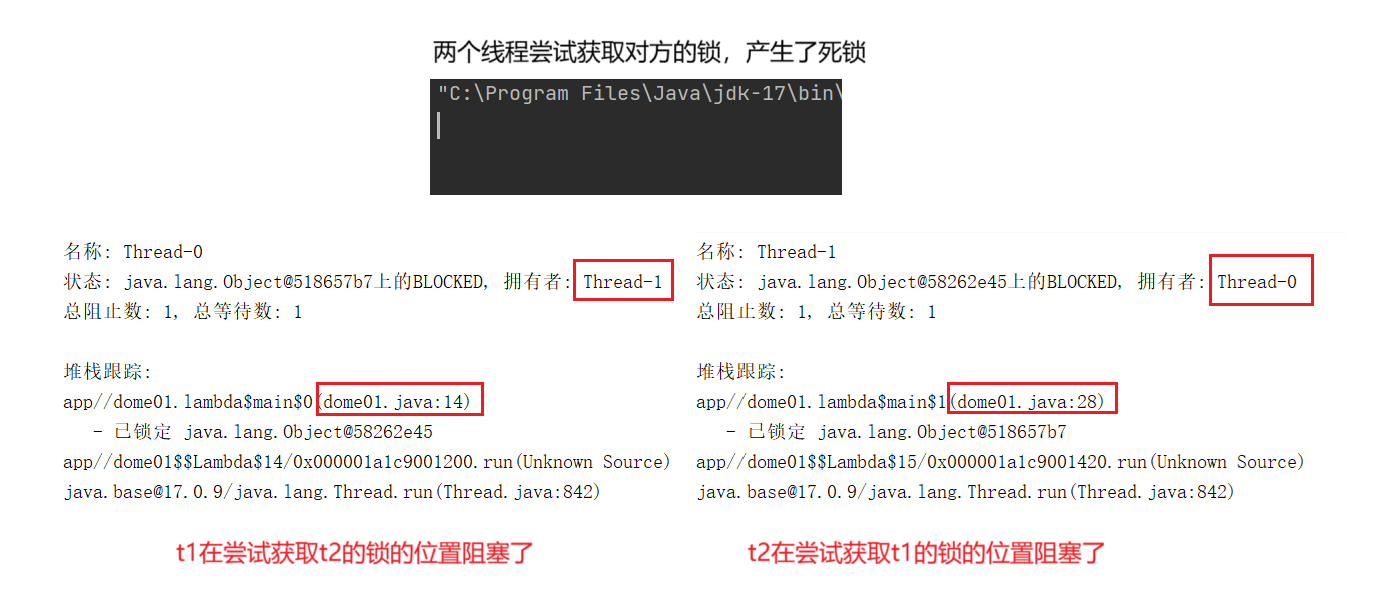 这里就可以写两个线程,两把锁,每个线程获取到一把锁之后,尝试获取对方的锁的代码就可以产生死锁了。