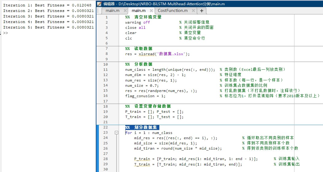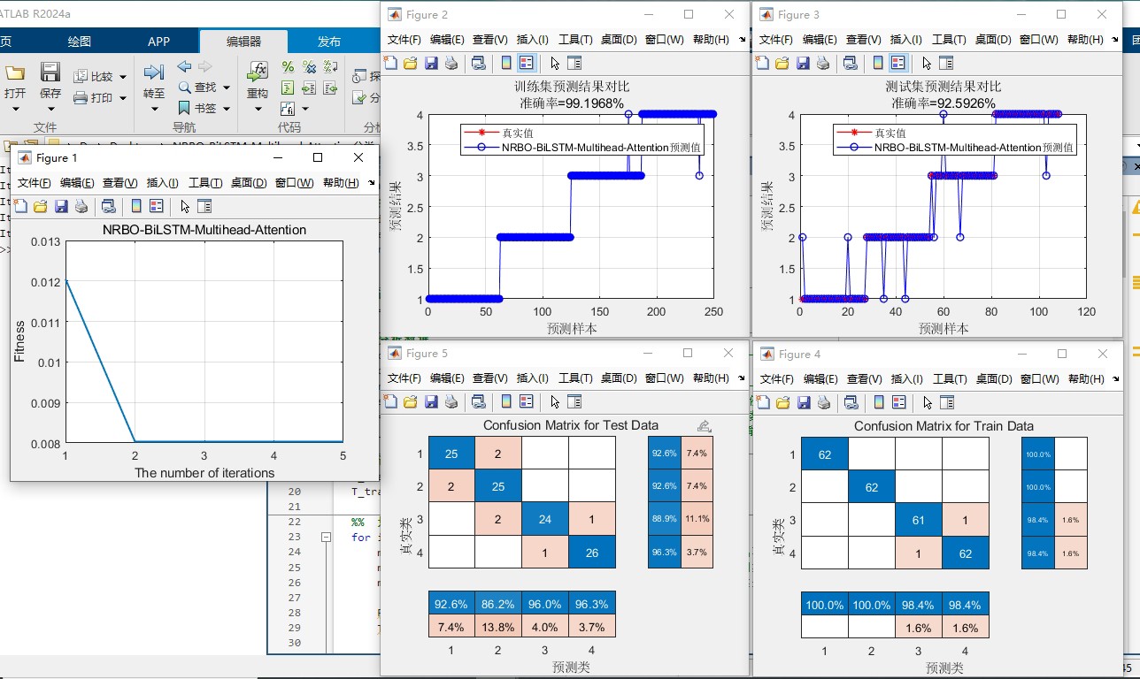 NRBO-BiLSTM-Multihead-Attention分类 基于牛顿拉夫逊优化算法优化双向长短期记忆网络(BiLSTM)结合多头注意力机制(Multihead-Attention)的数据分类预测(可更换为回归/单变量/多变量时序预测,前私),Matlab代码,可直接运行,适合小白新手 无需更改代码替换数据集即可运行 数据格式为excel BiLSTM可以更换为LSTM,GRU(前) 多头注意力(Multi-Head Attention)是一种基于自注意力机制(self-attention)的改进方法。 自注意力是一种能够计算出输入序列中每个位置的权重,因此可以很好地处理序列中长距离依赖关系的问题。 1、运行环境要求MATLAB版本为2022b及以上【没有高版本的可以私信我】 2、代码中文注释清晰,质量极高 3、运行结果图包括分类效果图,迭代优化图,混淆矩阵图等。 4、测试数据集,可以直接运行源程序。 适合新手小白