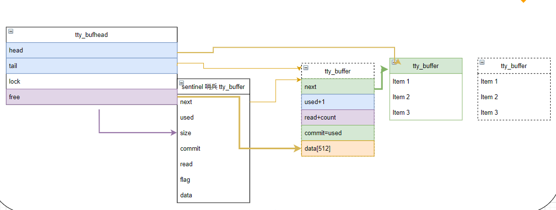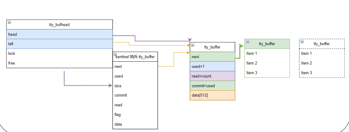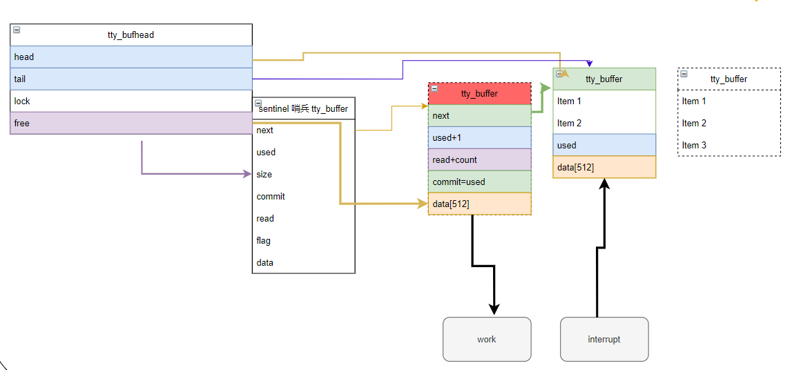 2) 中断往绿色tty_buffer中写入数据。