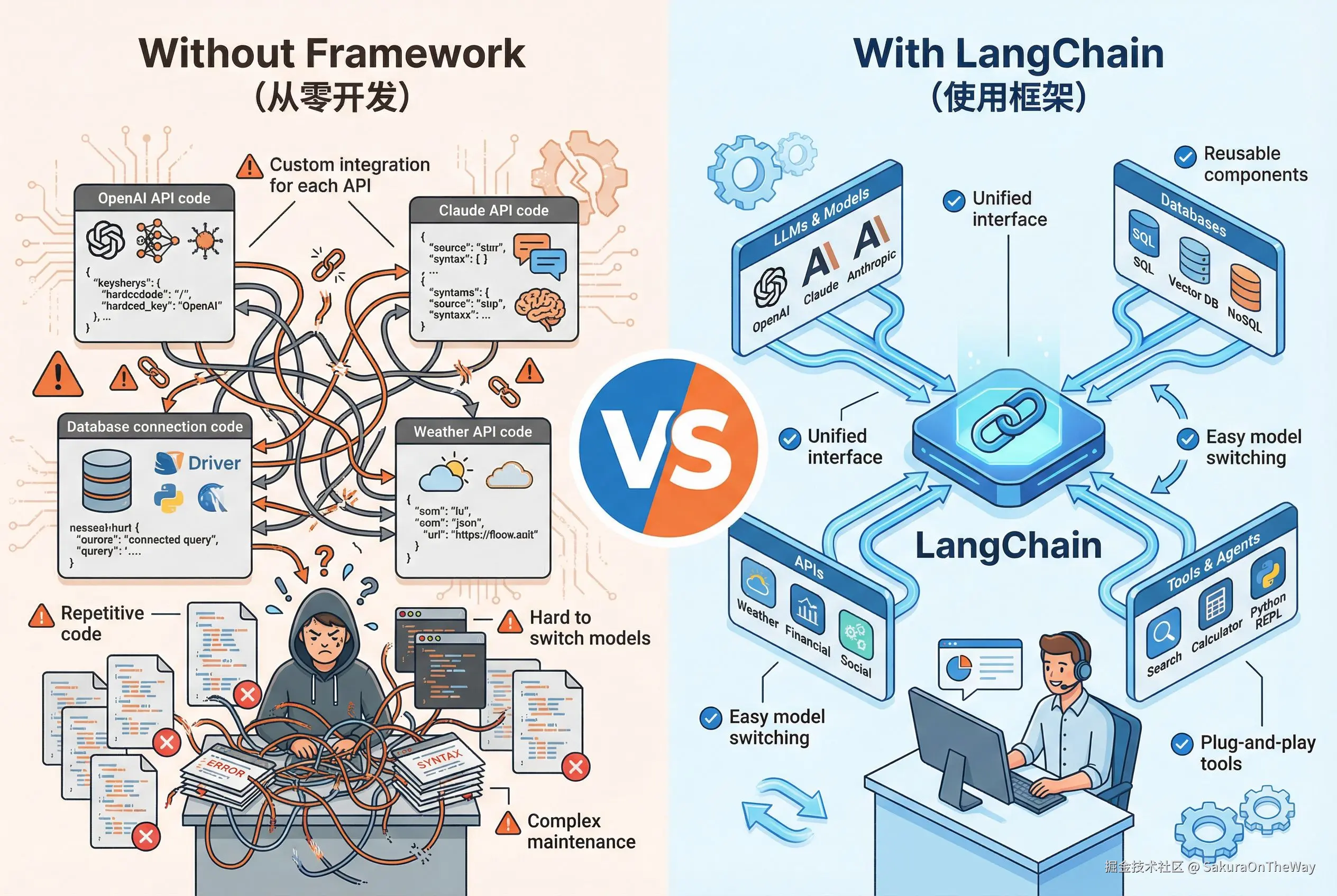 - 不使用 LangChain:需要手写所有的集成和逻辑代码