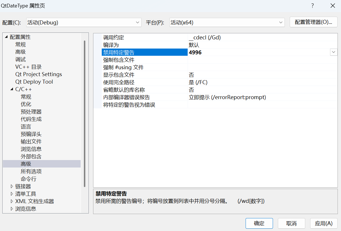 项目 -》 属性 -》C/C++ -》高级 中 禁用特定警告 添加 4996