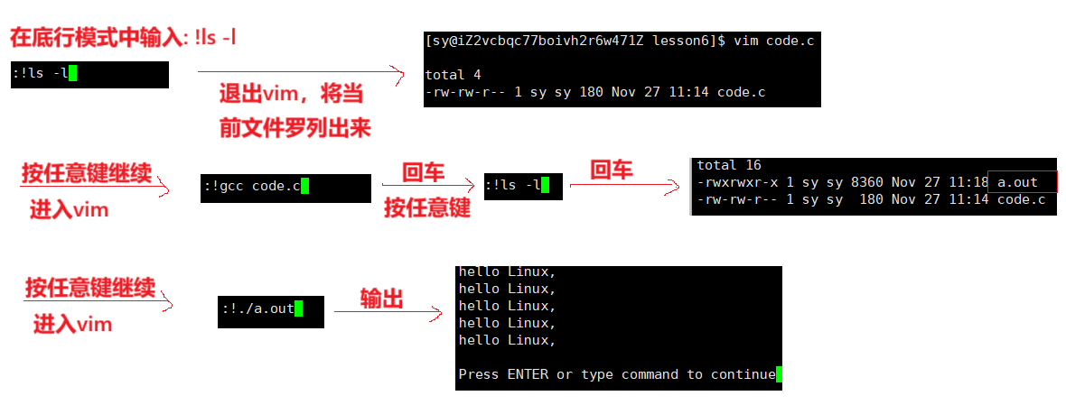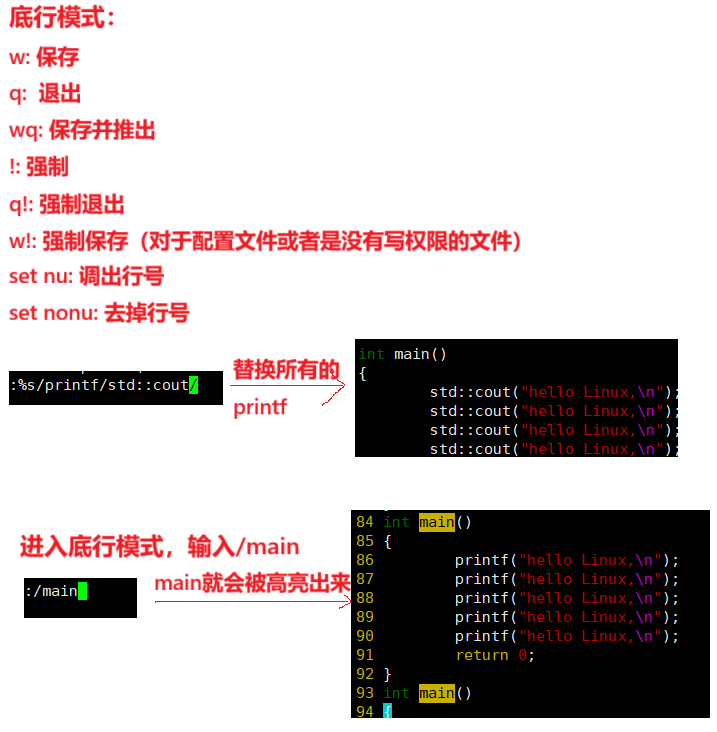文件保存或退出,也可以进行文件替换,找字符串,列出行号等操作。