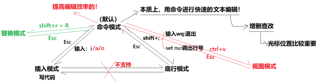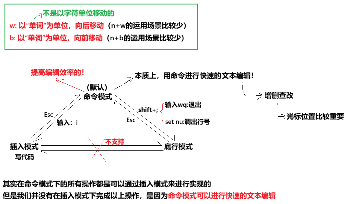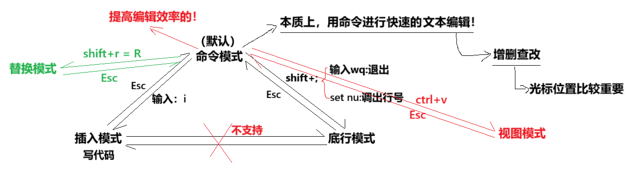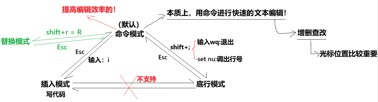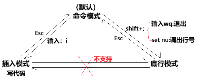 vim其实有很多的模式,但是只需要掌握3种就可以了,分别是命令模式、插入模式、底行模式,各模式的功能区分如下: