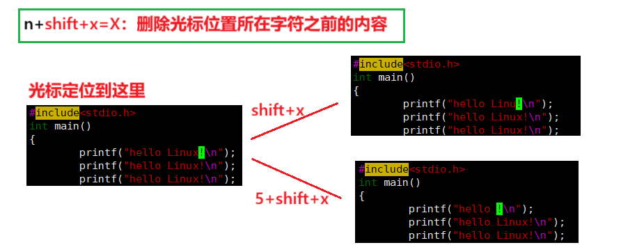 【nX】:表示删除光标所在位置的"前面"n个字符