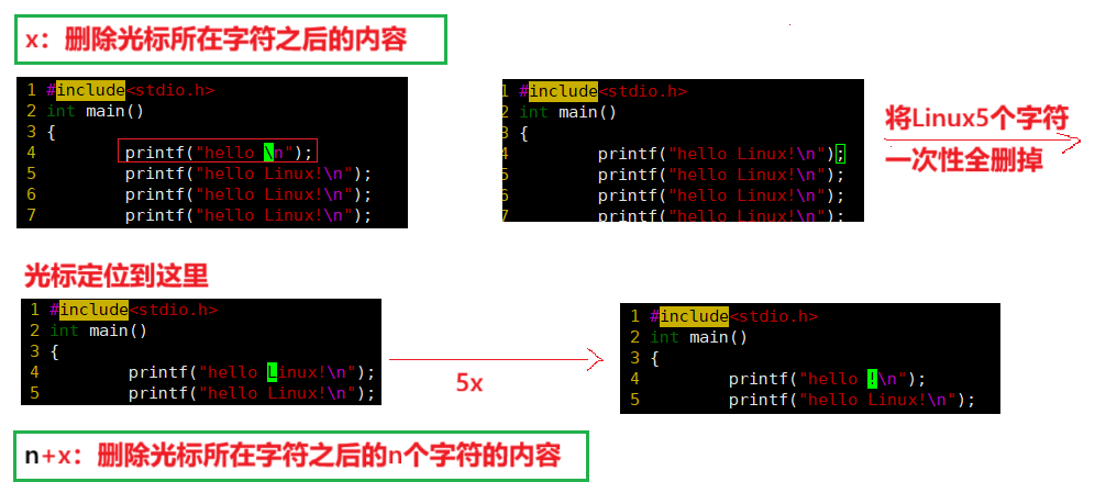 【nx】:表示删除光标所在位置的"后面(包含自己在内)"n个字符