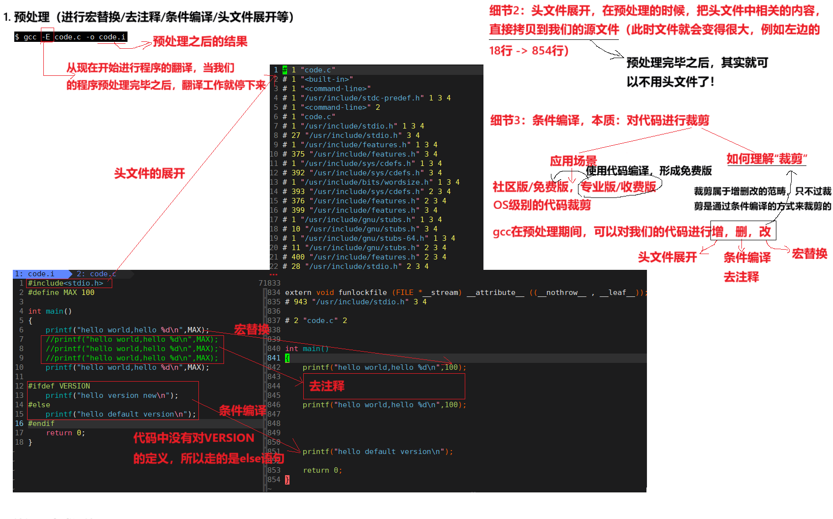 预处理(进行宏替换/去注释/条件编译/头文件展开等)