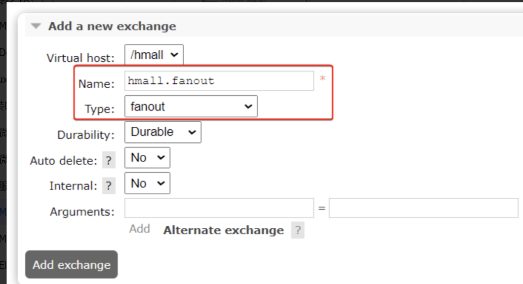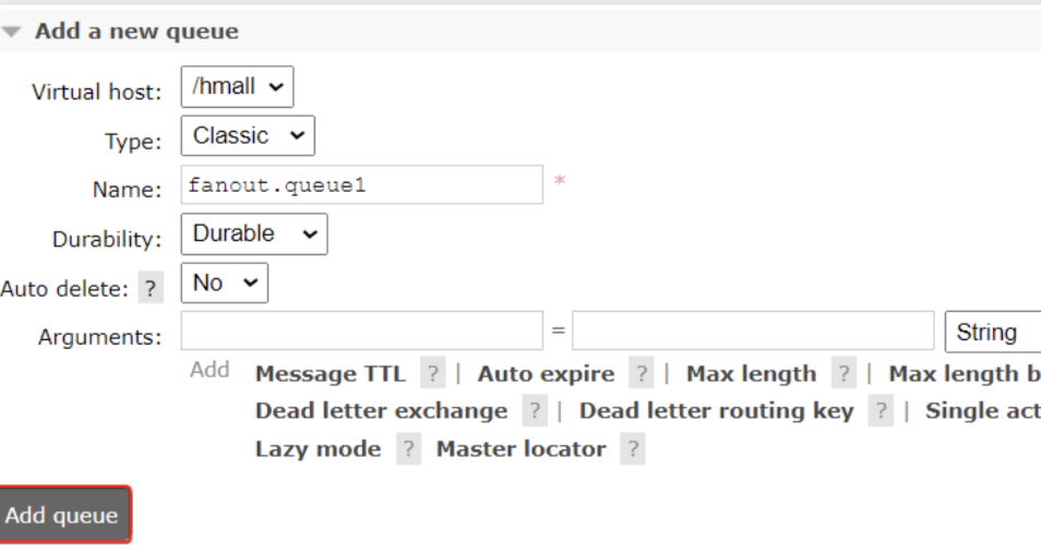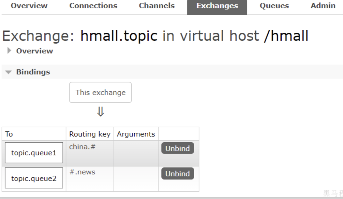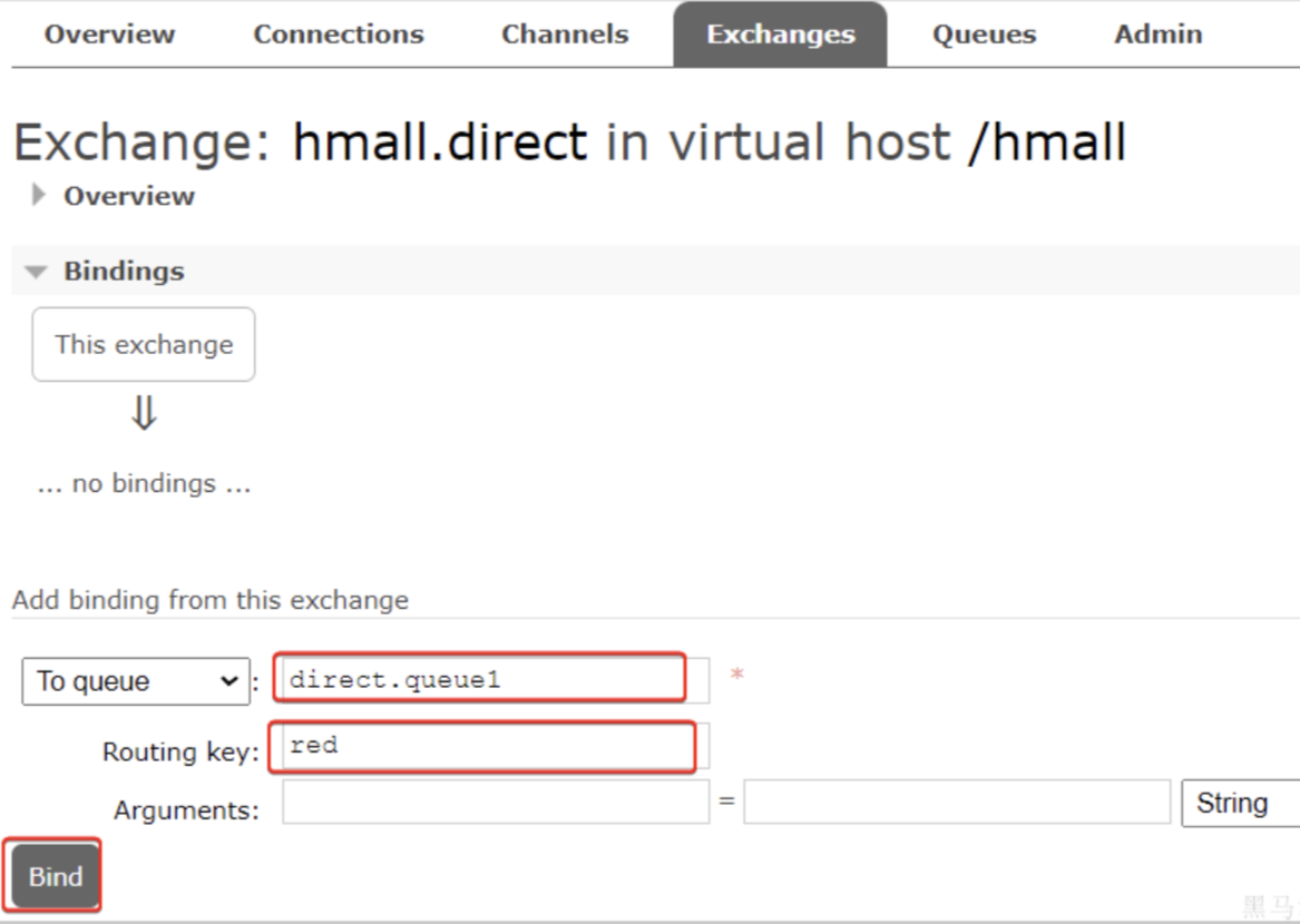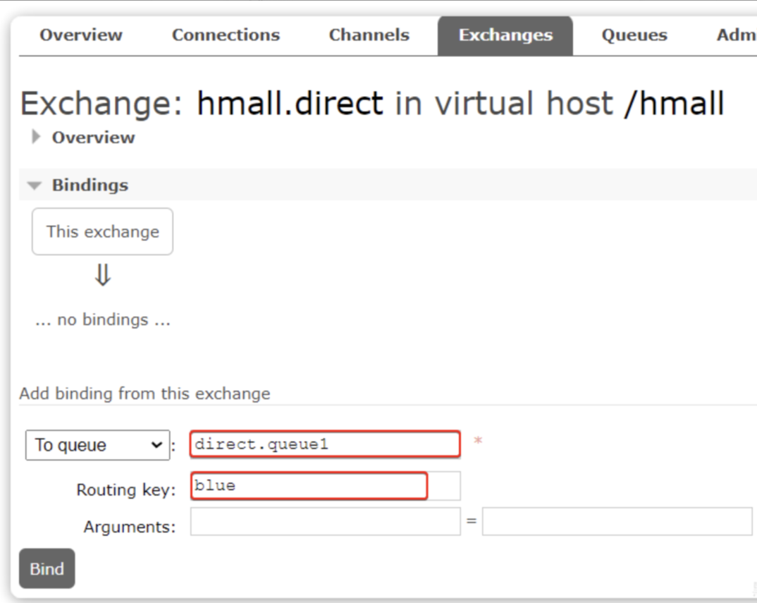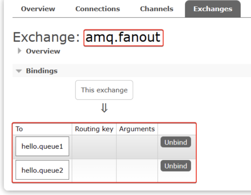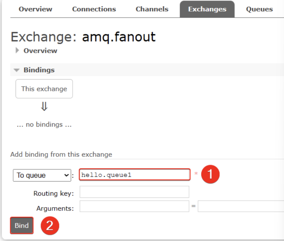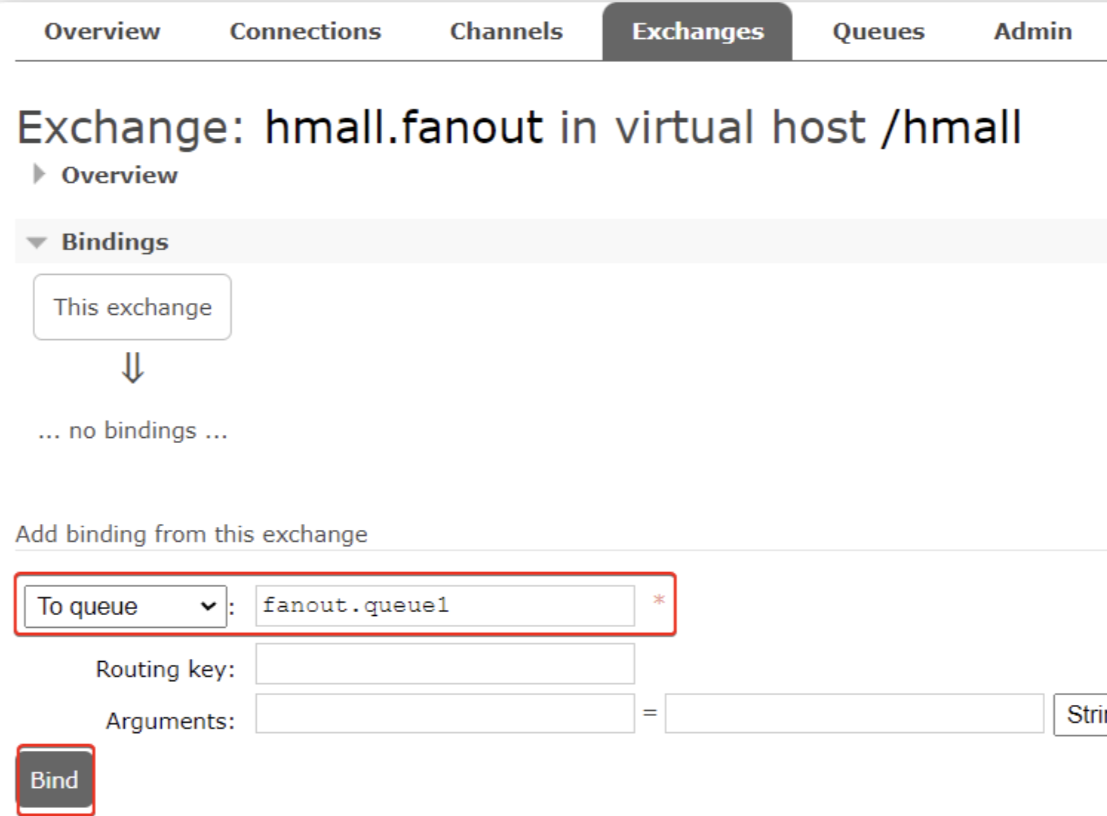 点击Exchanges选项卡,点击amq.fanout交换机,进入交换机详情页,然后点击Bindings菜单,在表单中填写要绑定的队列名称: