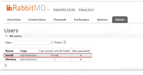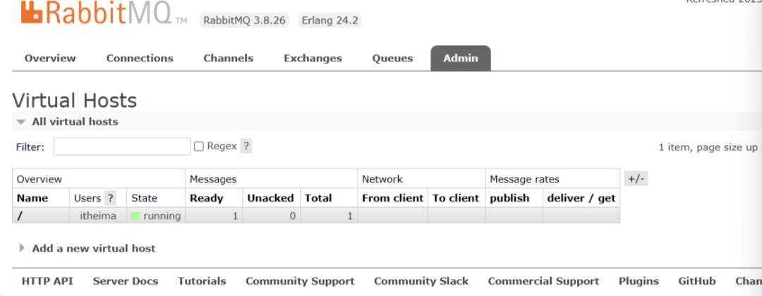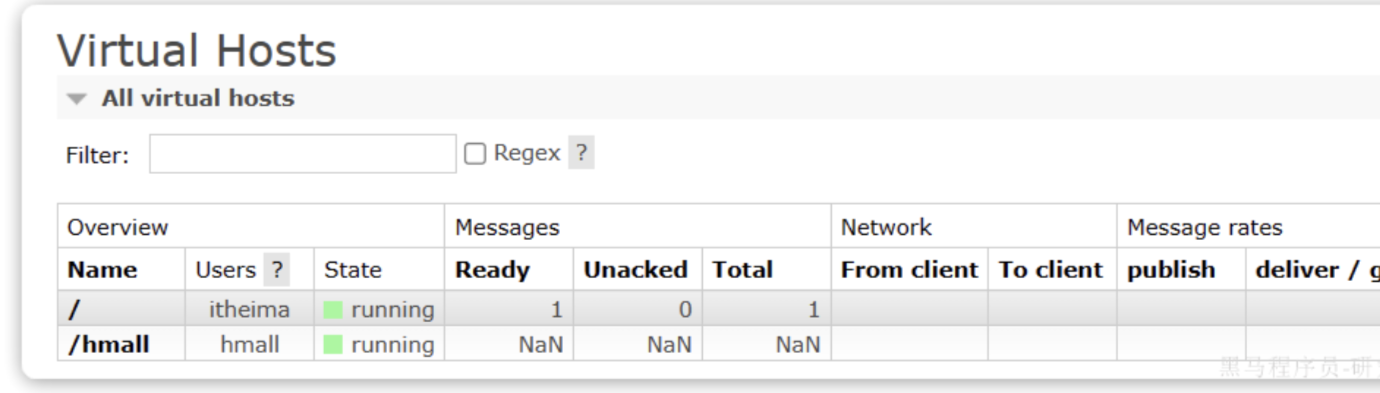 virtual host:虚拟主机,起到数据隔离的作用。每个虚拟主机相互独立,有各自的exchange、queue