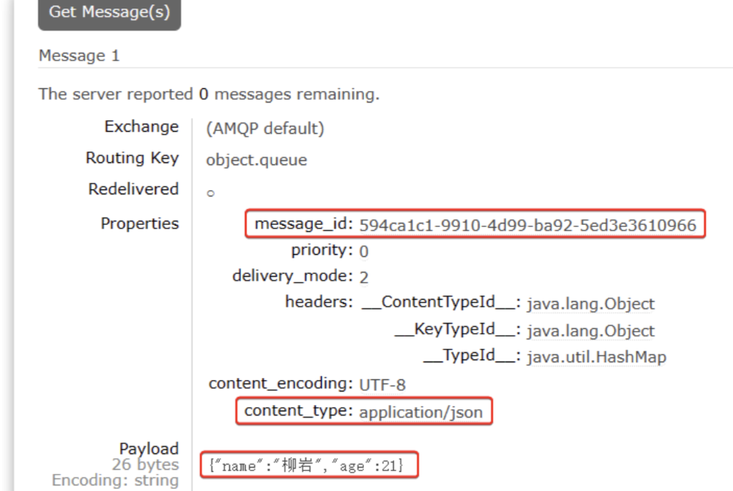 使用MessageBuilder创建的Message对象是Spring AMQP的Message类型,它直接包含了字节数组 body 和消息属性。