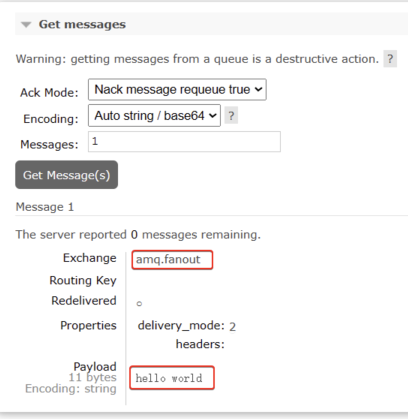 此时,我们再次向amq.fanout交换机发送一条消息。会发现消息依然没有到达队列!!