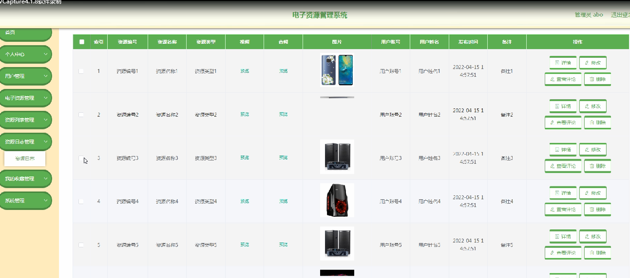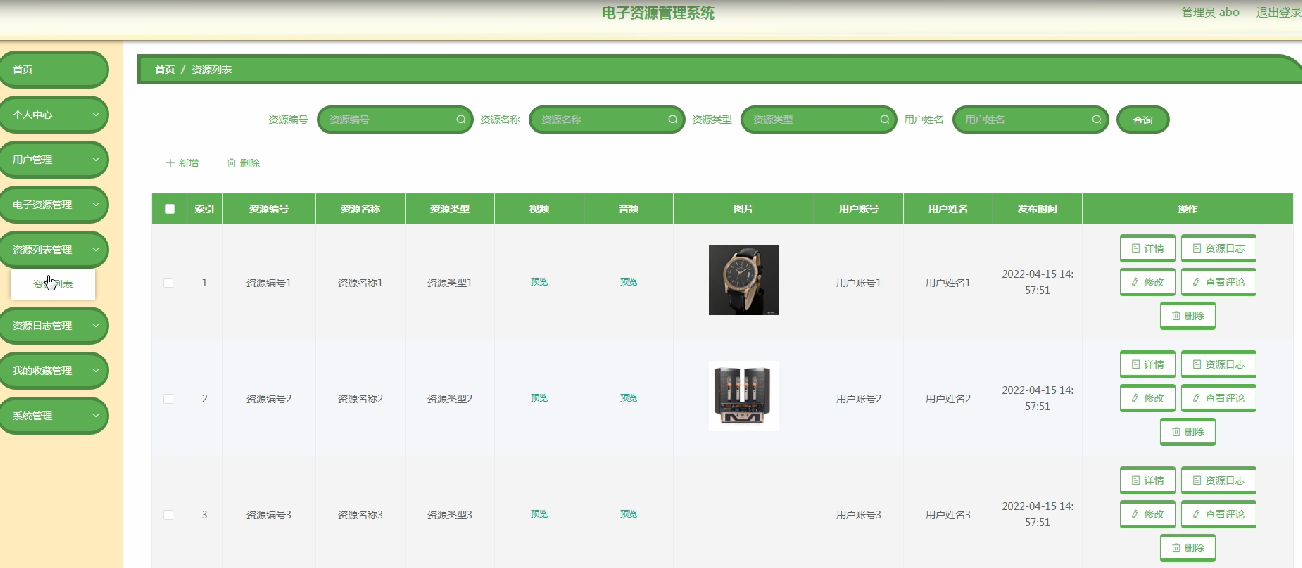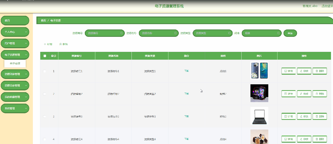 电子资源管理,在电子资源管理页面可以对索引,资源编号,资源名称,资源类型,简介,规格,图片等信息进行详情,修改和删除等操作,如图5-8所示。