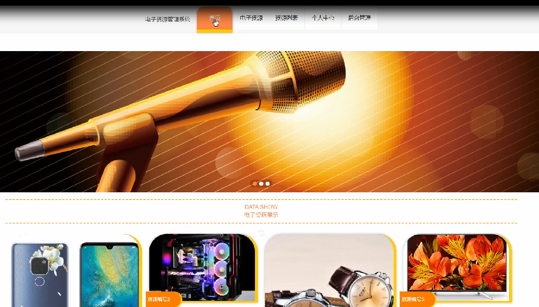 电子资源管理系统,在系统首页可以查看首页,电子资源,资源列表,个人中心,后台管理等内容,并进行详细操作;如图5-1所示。