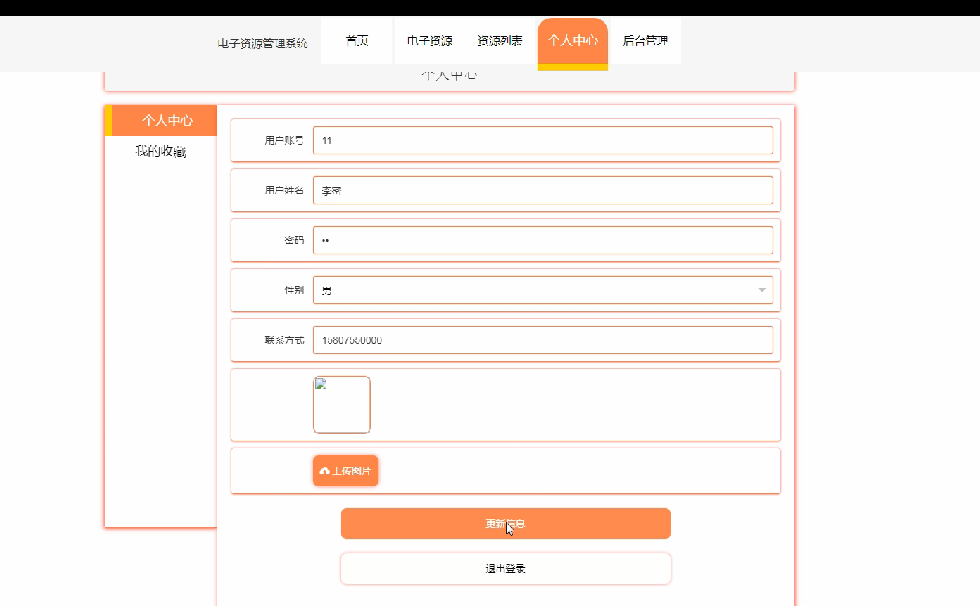 个人中心,在个人中心页面通过填写用户账号,用户姓名,密码,性别,联系方式,图片等内容进行更新信息操作,并对我的收藏进行详细操作;如图5-4所示。