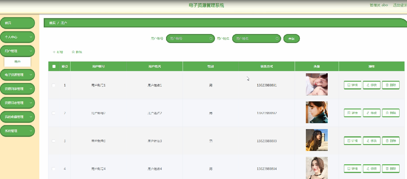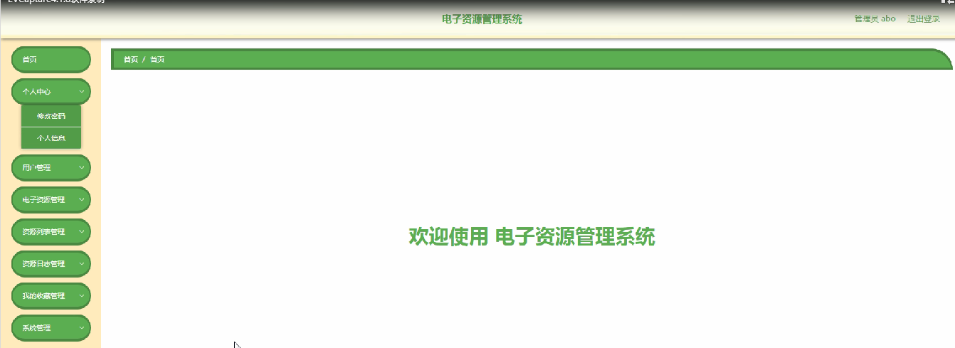 管理员登录系统后,可以对首页,个人中心,用户管理,电子资源管理,资源列表管理,资源日志管理,我的收藏管理,系统管理等功能进行相应的操作管理,如图5-6所示。