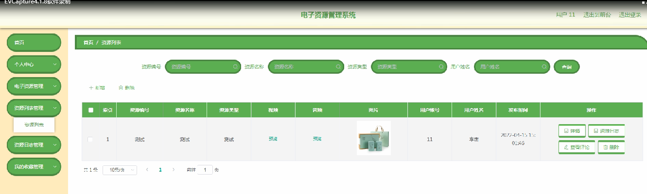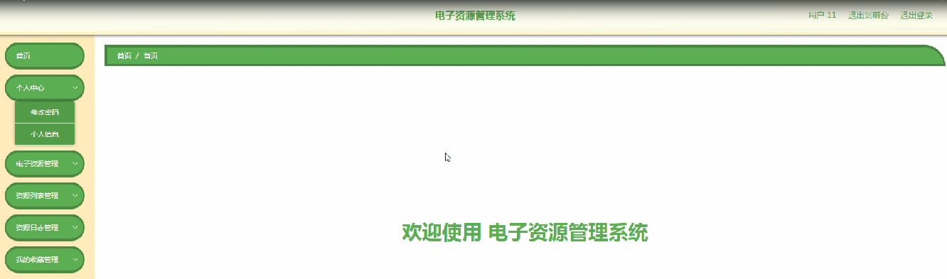 用户登录进入电子资源管理系统可以对首页,个人中心,电子资源管理,资源列表管理,资源日志管理,我的收藏管理等功能进行相应操作,如图5-11所示。