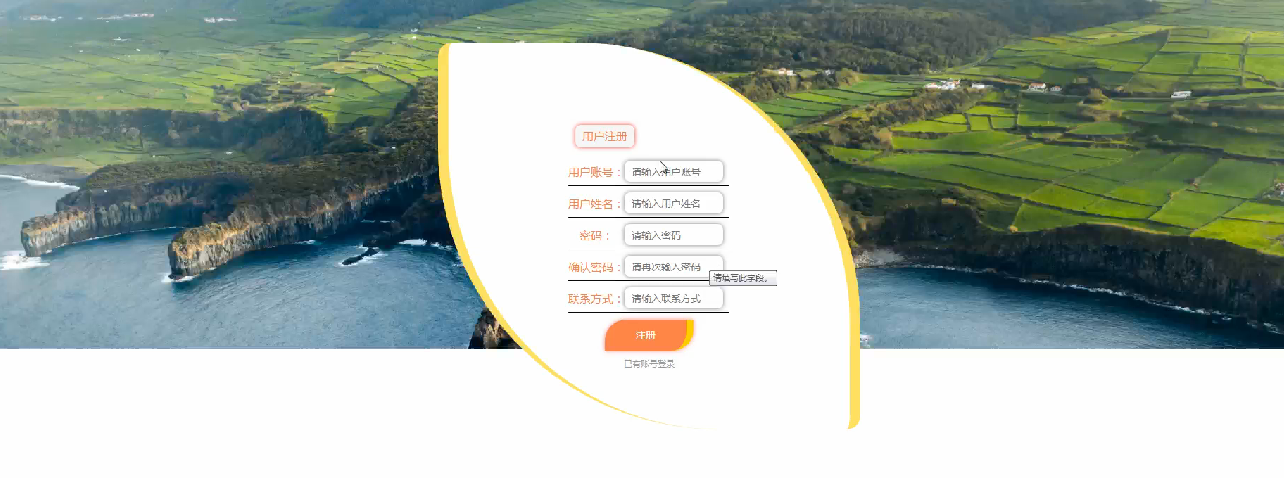 用户注册,在用户注册页面通过填写用户账号,用户姓名,密码,确认密码,联系方式等信息进行注册操作,如图5-2所示。