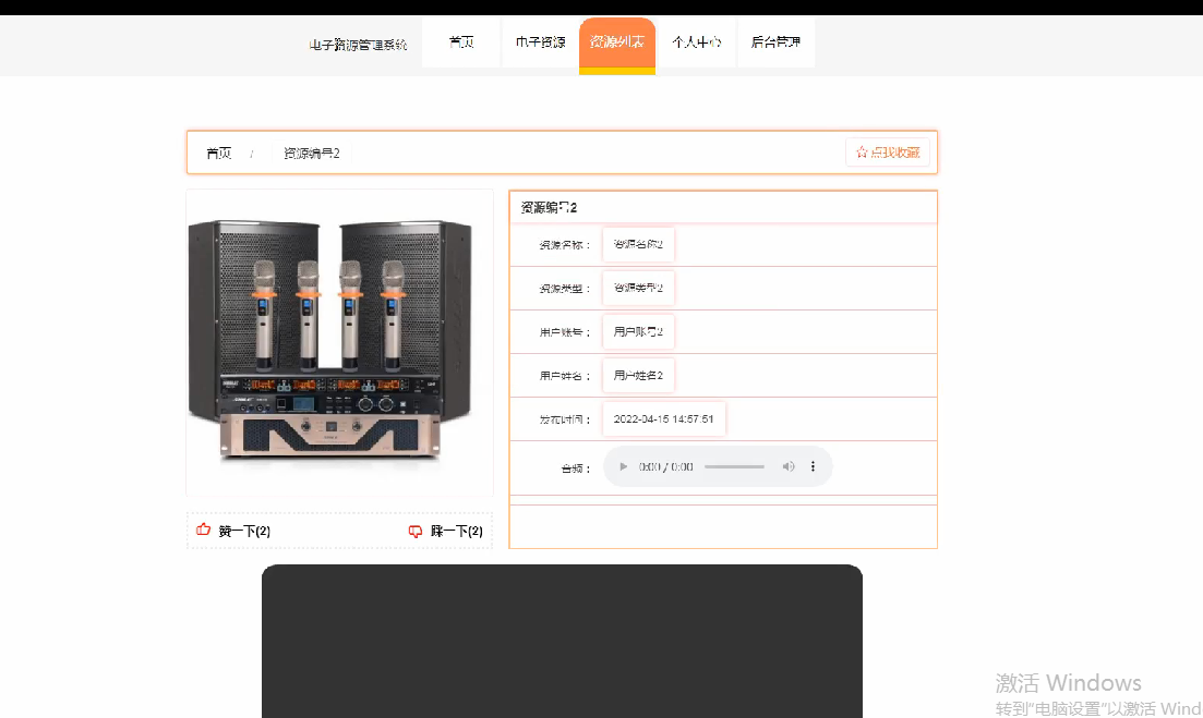 资源列表,在资源列表页面可以查看资源编号,资源名称,资源类型,用户账号,用户姓名,发布时间,音频等内容,并进行赞一下,踩一下,点我收藏等操作,如图5-3所示。