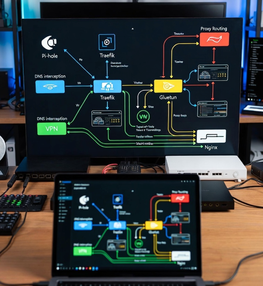 Traefik 使用 TLS 直通模式,仅路由流量,不终止加密。 - VPN 隧道与代理(Gluetun + Nginx 作用):