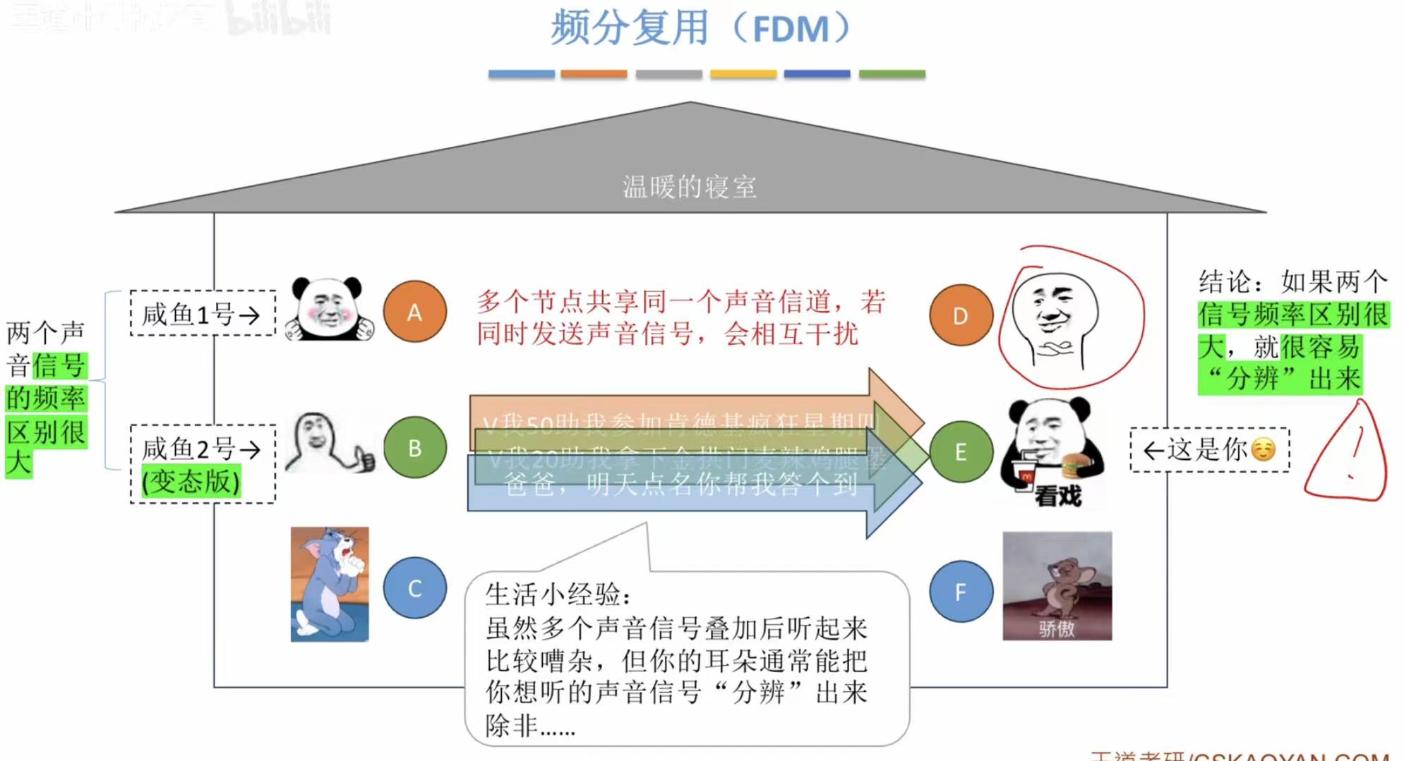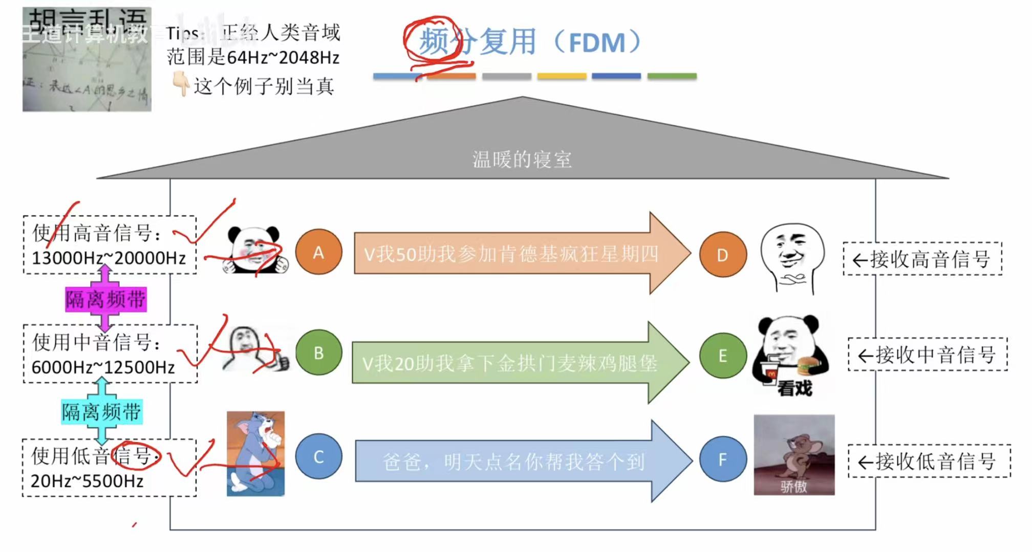 时间久了,大家都很熟悉对方的声音,就比如一个声音细一点儿的和一个低音炮一起说话,你一下子就能分清谁说的话,所以寝室长就决定了,按照说话的频率 分,谁经常用什么声音说话,就能直接认出来是谁,所以就算一起说话,也能听出来谁是谁,这就是频分复用 。