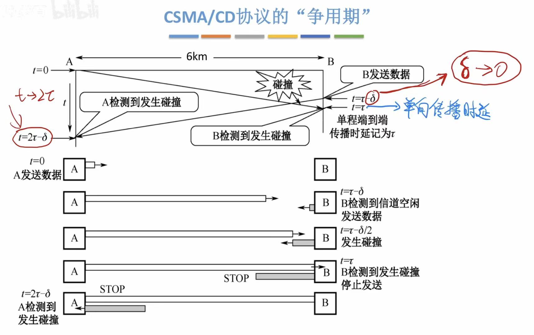 如争用期的例子,最极限的时候是A无限接近于B,但没有到B,所以此时的帧长还不足以在B刚出现就检测出冲突,